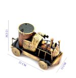 This decorative brass train pen holder features an engine with a smokestack and tender. It sits on a wooden table.