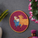 A beautiful pichwai artwork showcasing three cows in a perfect circle. The cows are adorned with intricate jewelry and stand on a wooden plate with a colorful floral border.